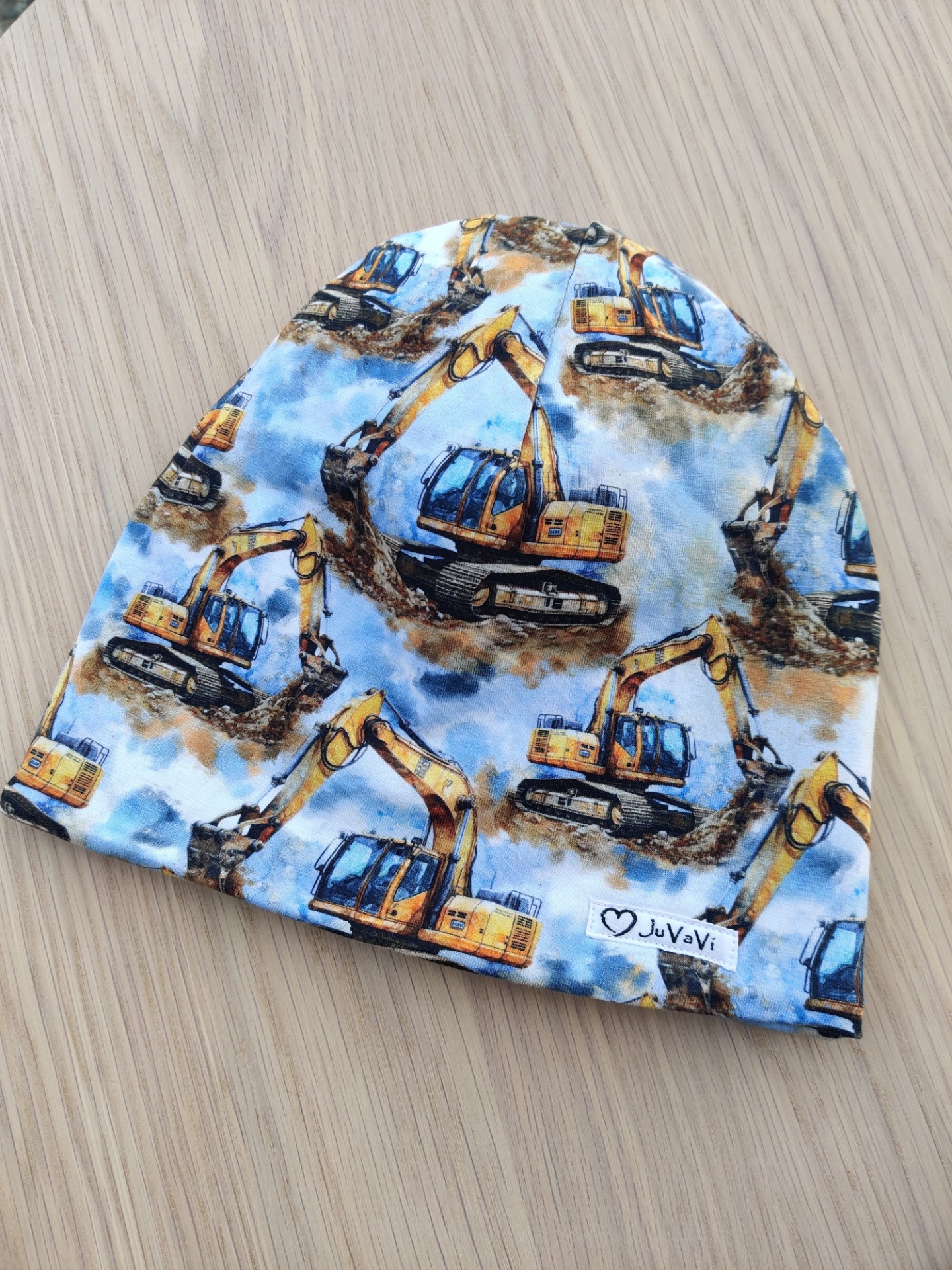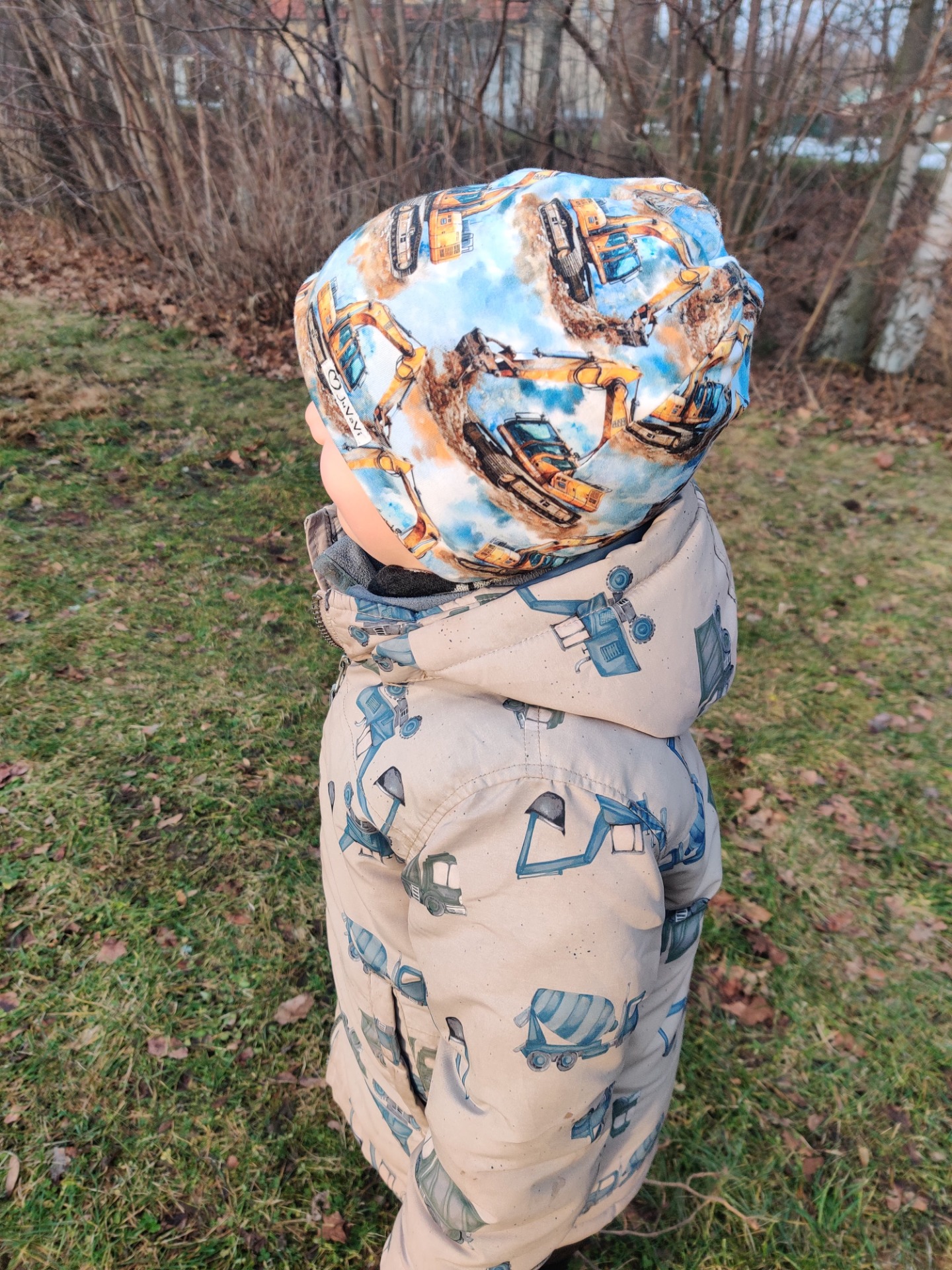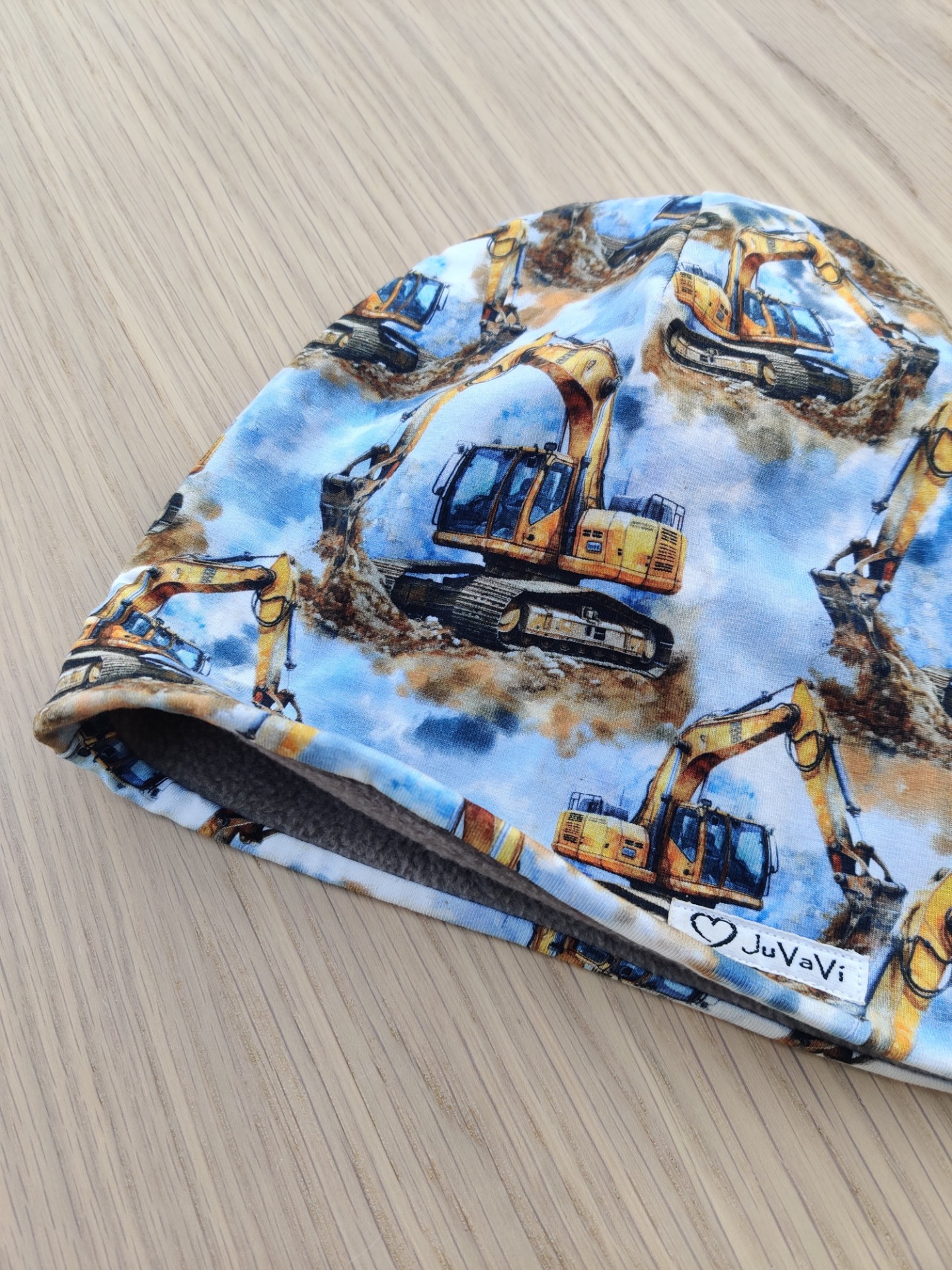Fleecefodrad mössa med grävmaskiner.