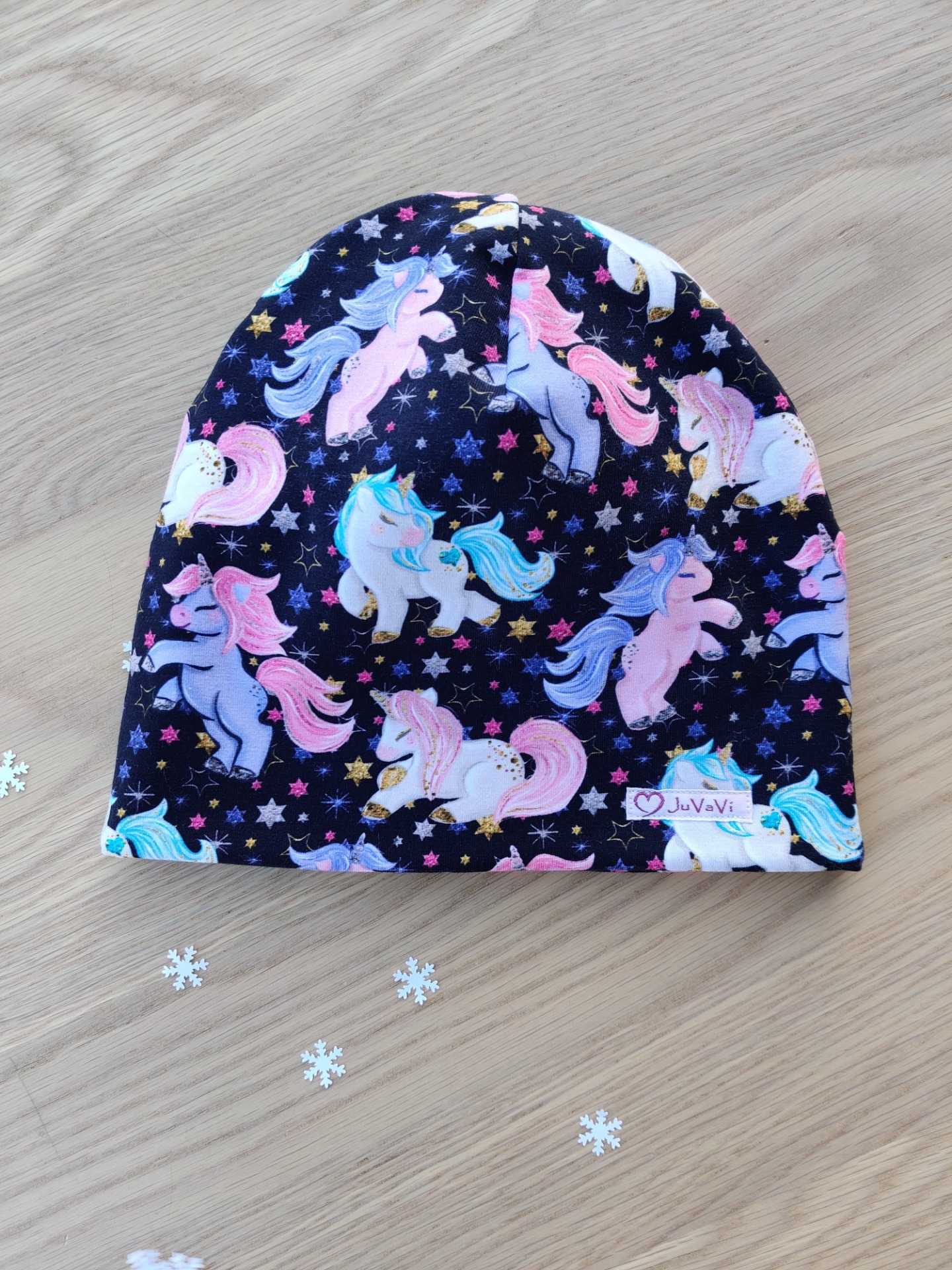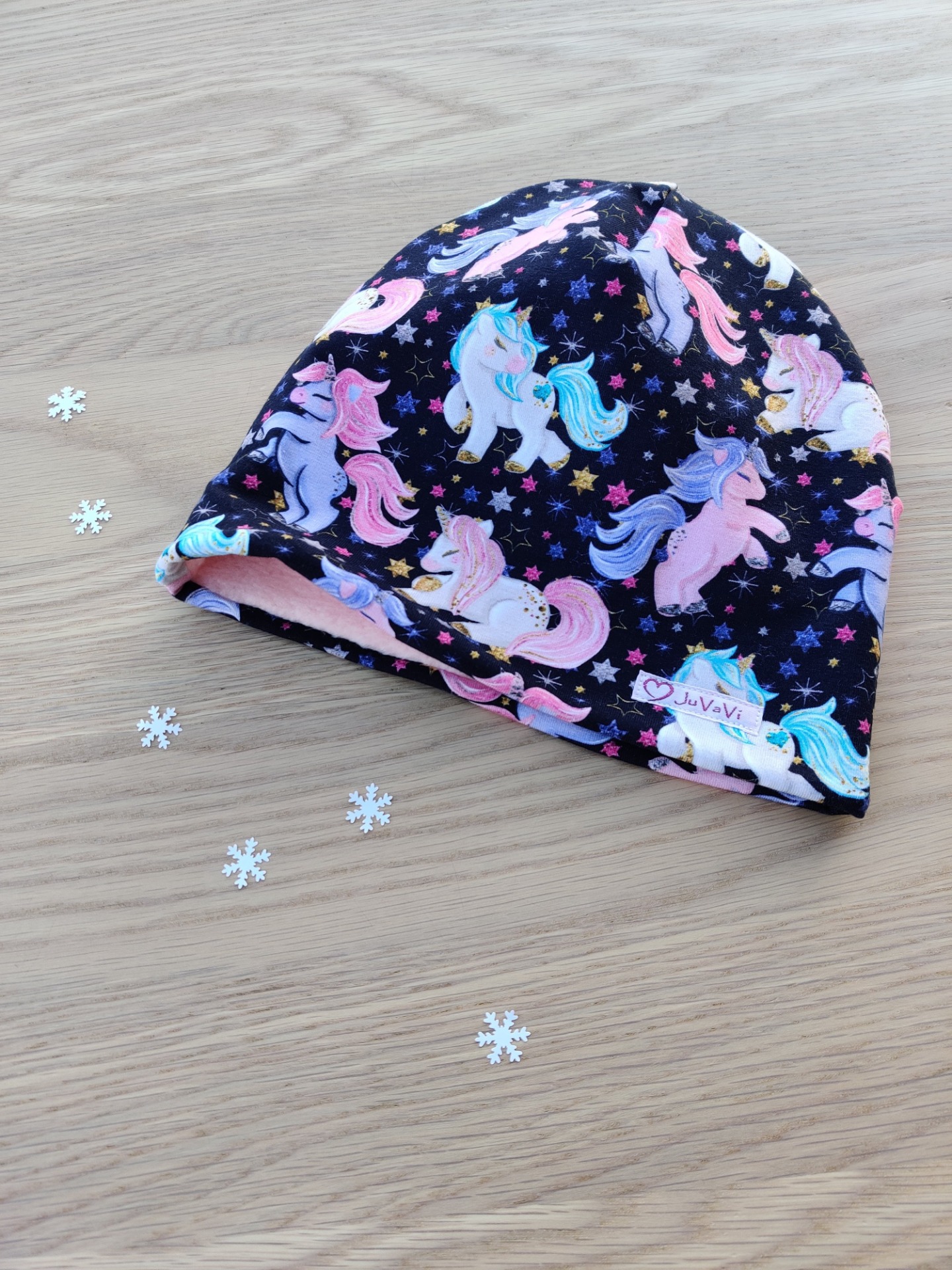Fodrad mössa med söta enhörningar med fleece på insidan.
