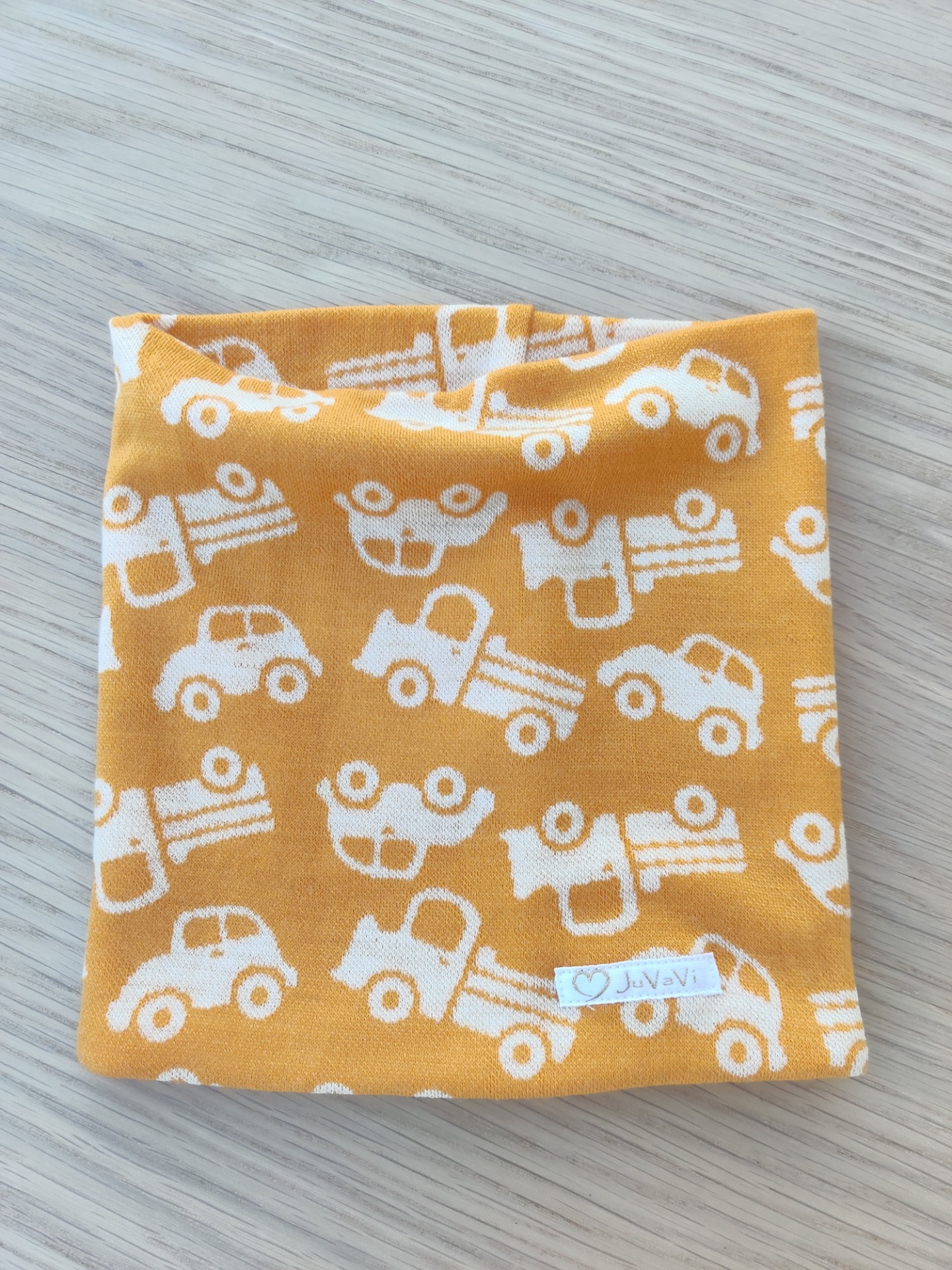 Gul buff med motiv av bilar i 100 % merinoull.