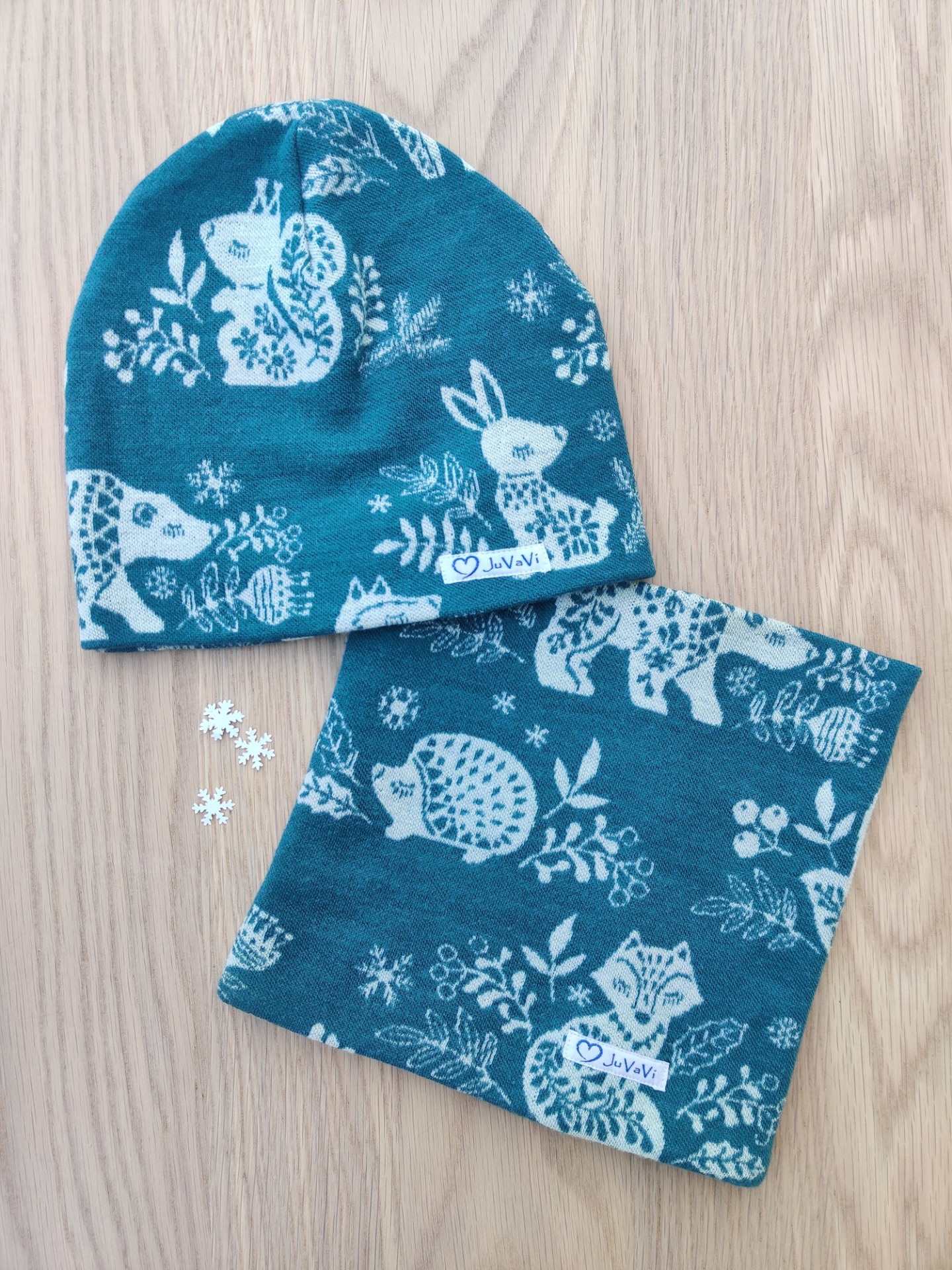 Vackert merinoullset med skogsdjur. Färg: petrol