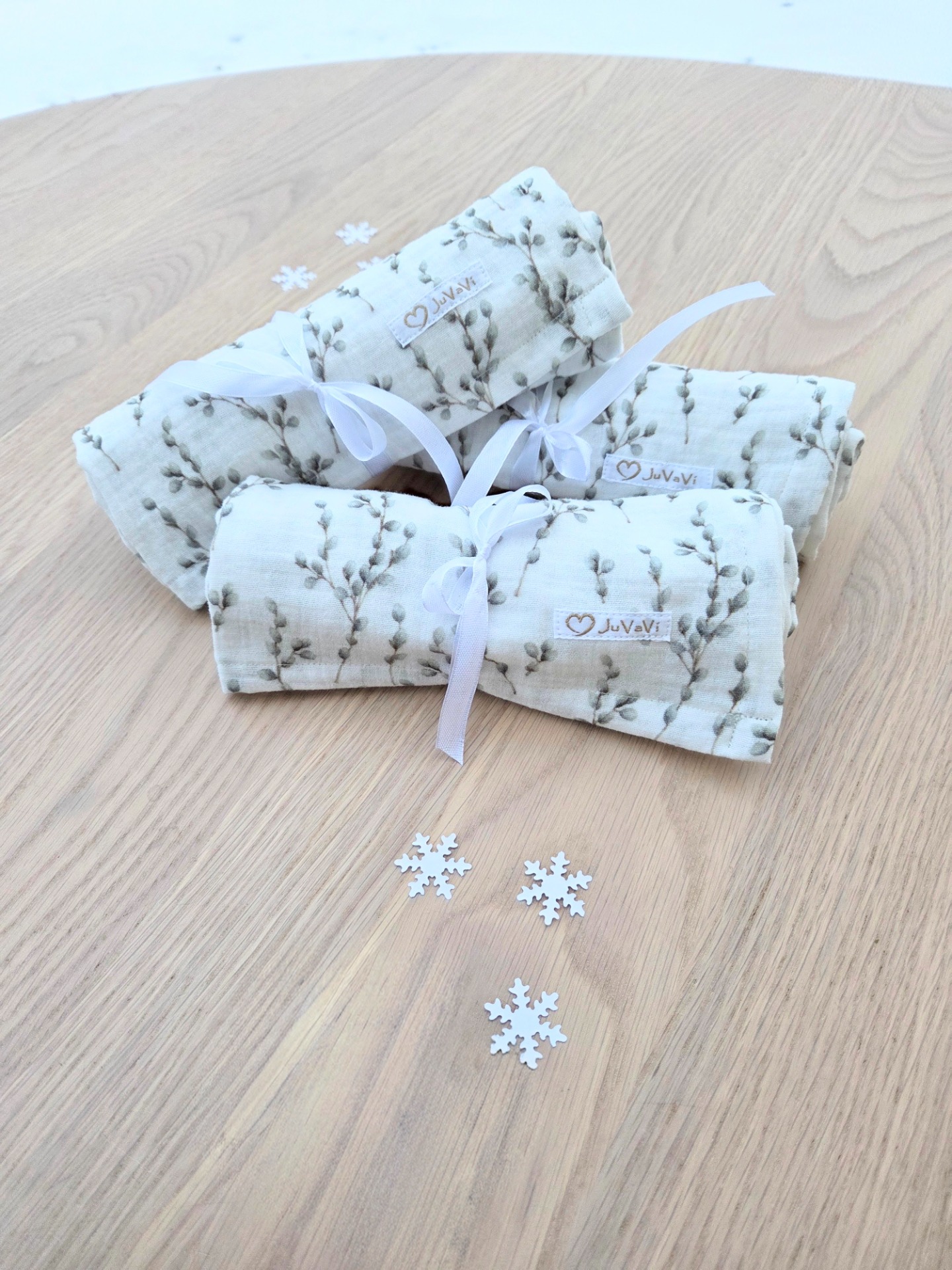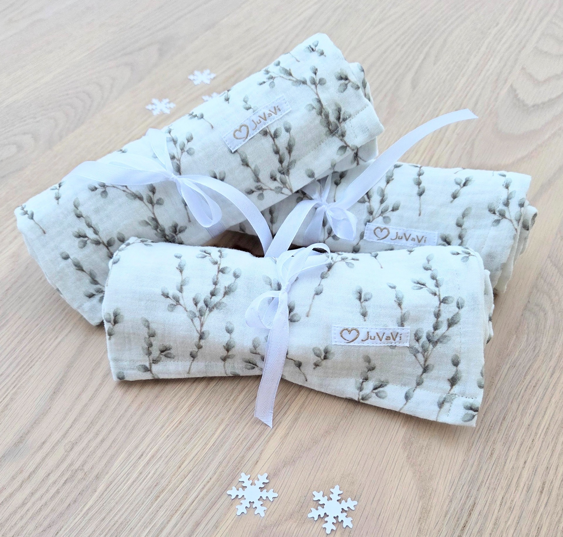 Tre mjuka tvättlappar i härligt muslintyg.