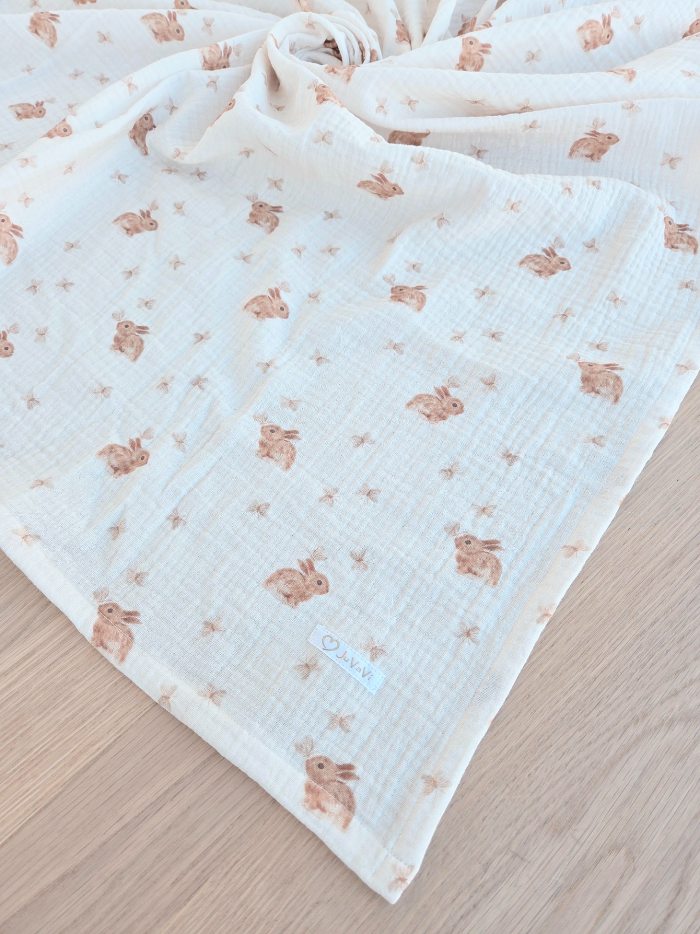 Stor muslinfilt med söta kaniner och fjärilar.