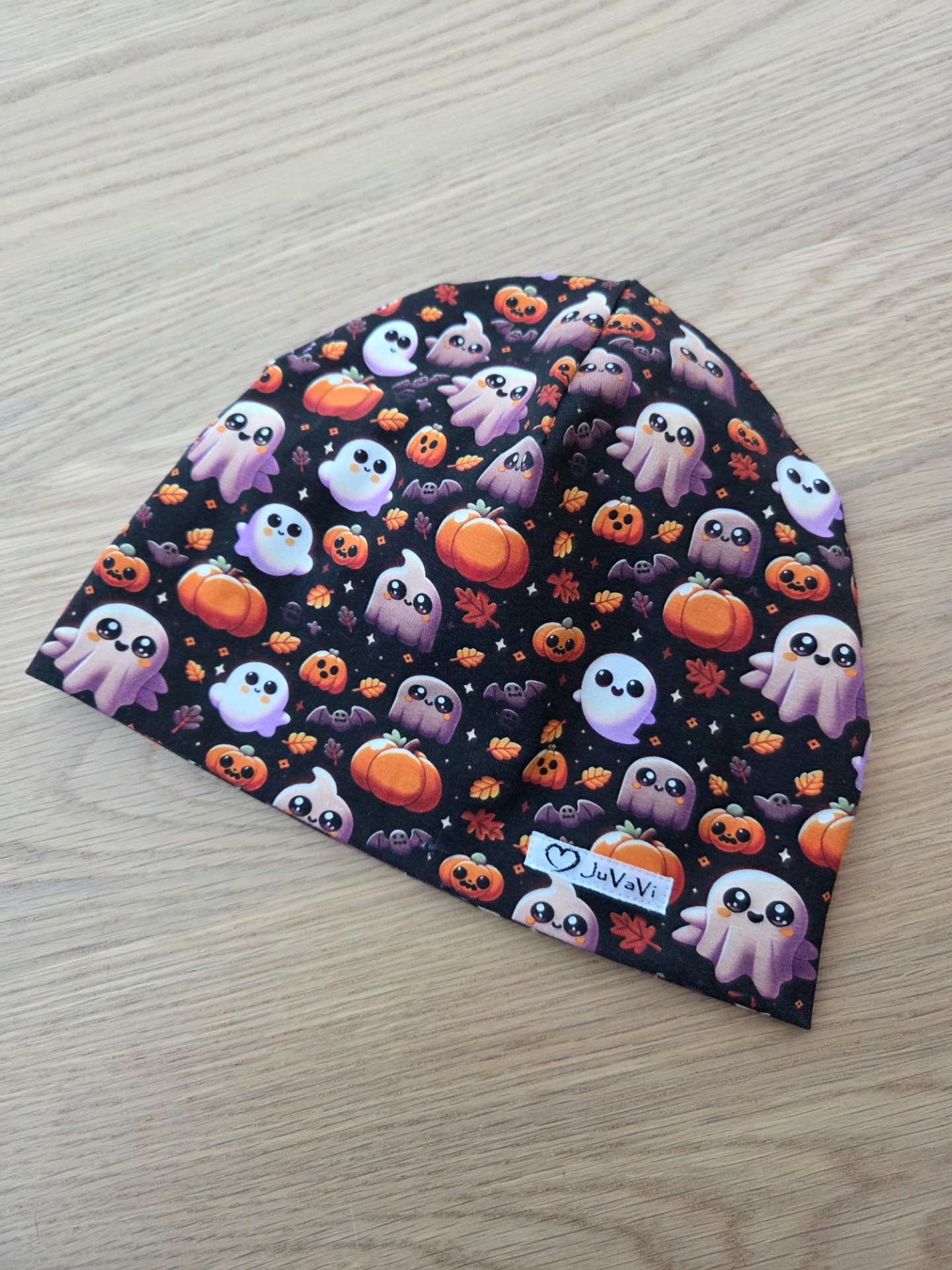 Trikåmössa med halloweenmotiv av spöken och pumpor.